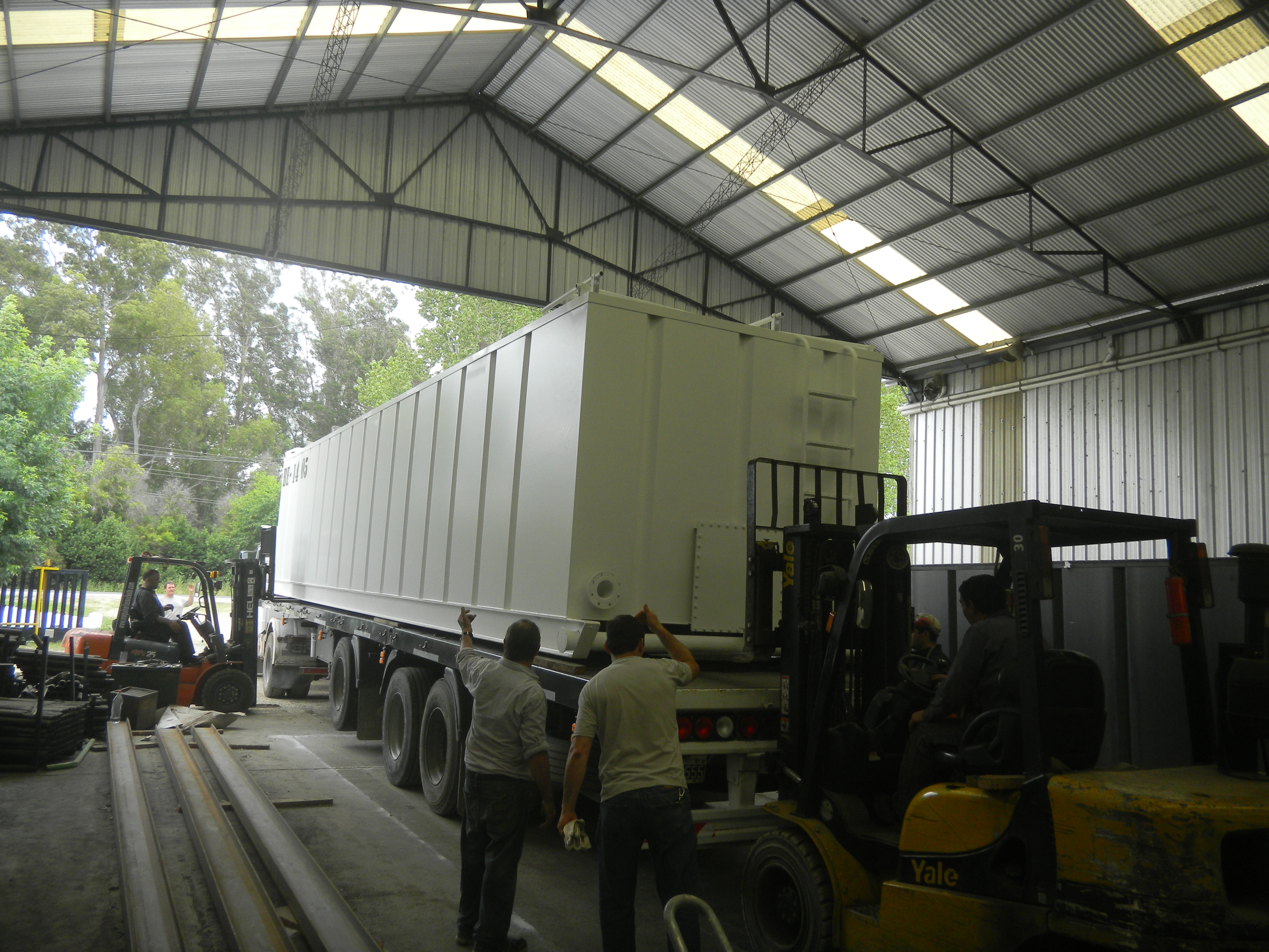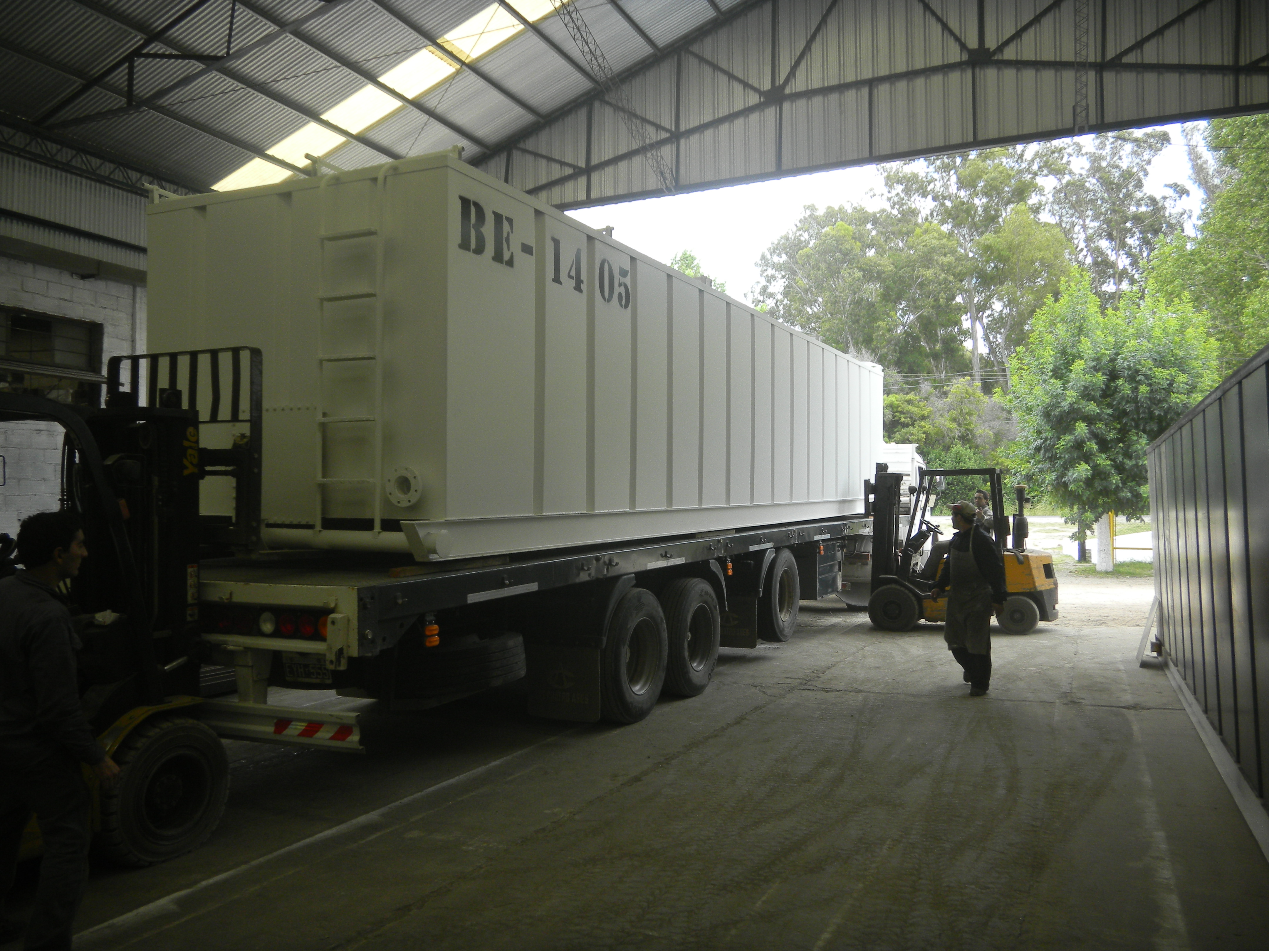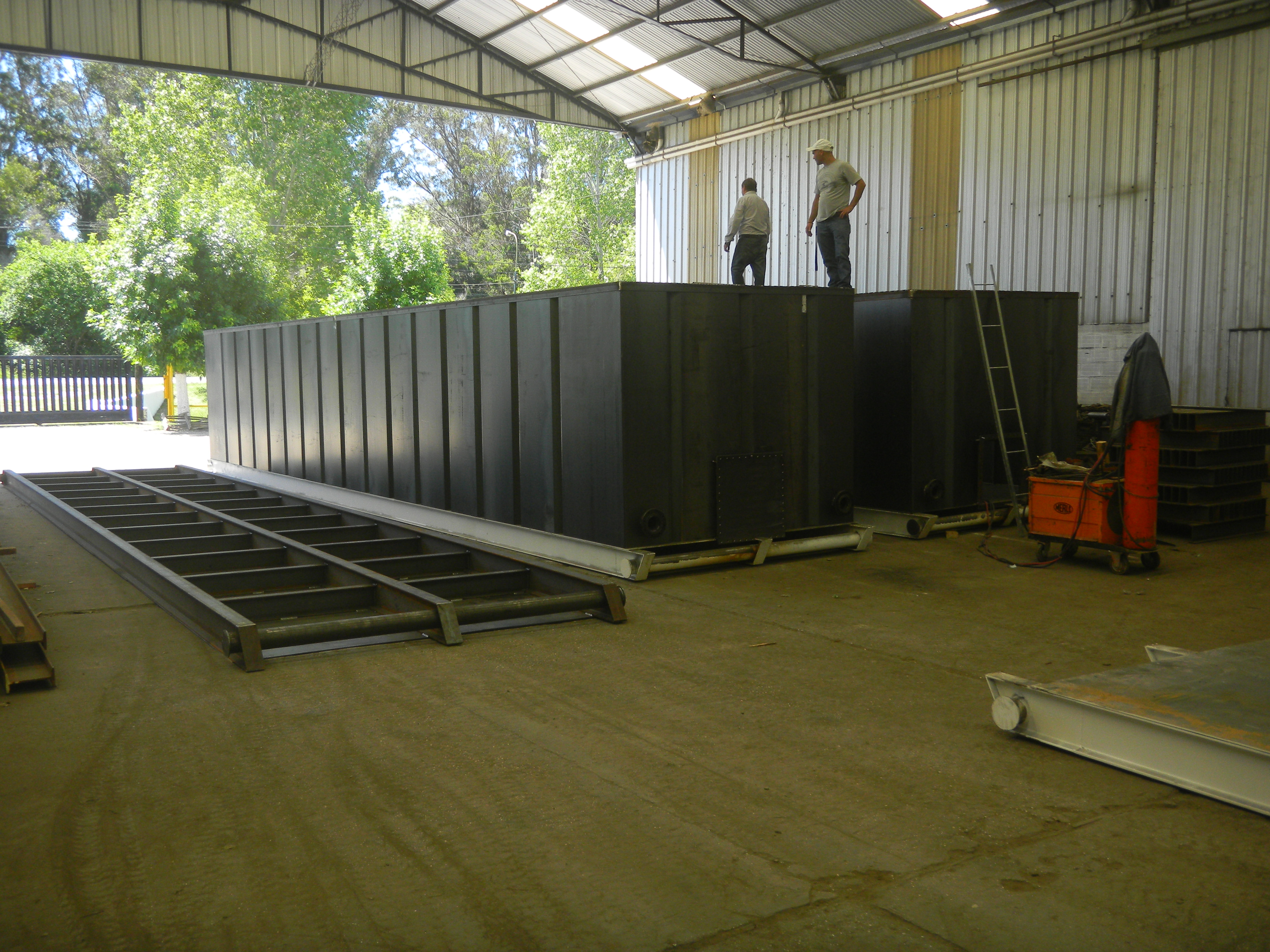Pileta de 70 m3, de 12 mts x 2.44m x 2.44m montada sobre patín triple de IPN 250. Reforzada en su interior con caño de IPN de 80. División interior al centro de la misma dejando dos porciones de 35m3 cada uno. 8 Vértices interiores a 45 grados en chapa 1/4 para evitar acumulación de Lodo en la pileta.